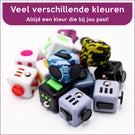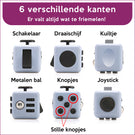 De Fidget Cube kan met de duim en wijsvinger van de hand worden gebruikt. De kubus heeft 6 verschillende vlakken in de vorm van een joystick, een schakelaar, een kuiltje, een metalen bal en een draaischijfje. Hiermee kunt u rollen, flippen, wrijven, draaien, drukken en glijden. Dit heeft allemaal een positief effect op de concentratie van u of uw kind.